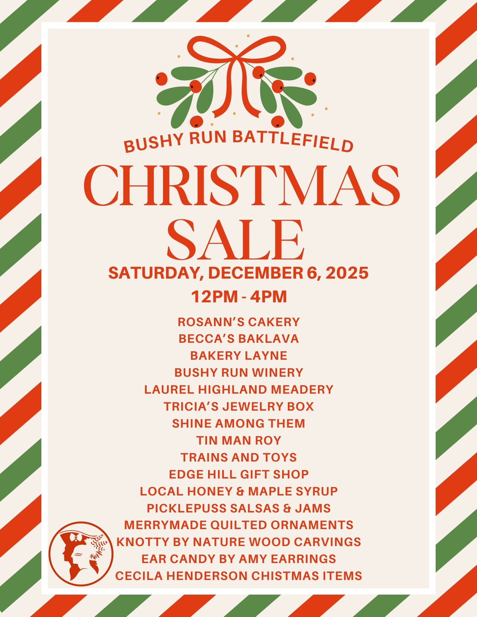 The Bushy Run Christmas Sale returns on Saturday, December 6 from 12pm-4pm! Our museum transforms into a holiday market featuring local vendors, artisans, bakers, and more. Admission to the market is free!